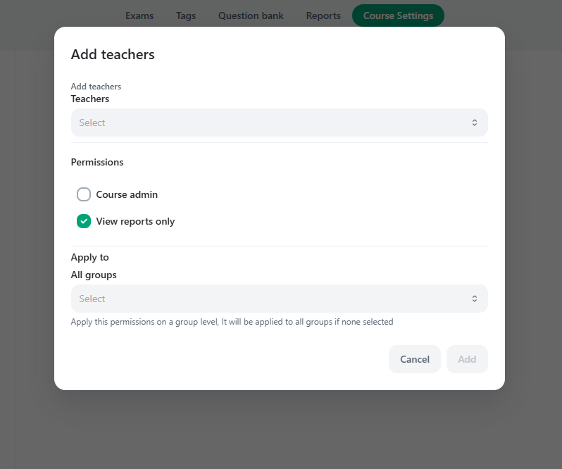 For members with “View Reports Only” permission, you can optionally specify which student groups they should have access to:- Select one or more groups from the dropdown