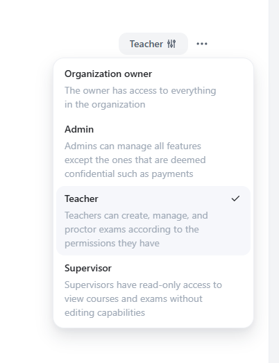 - مدير: يتيح هذا الدور الوصول إلى جميع الدورات والامتحانات، إلى جانب إدارة الطلاب والمعلمين والمديرين والمهام الإدارية الأخرى داخل المؤسسة.